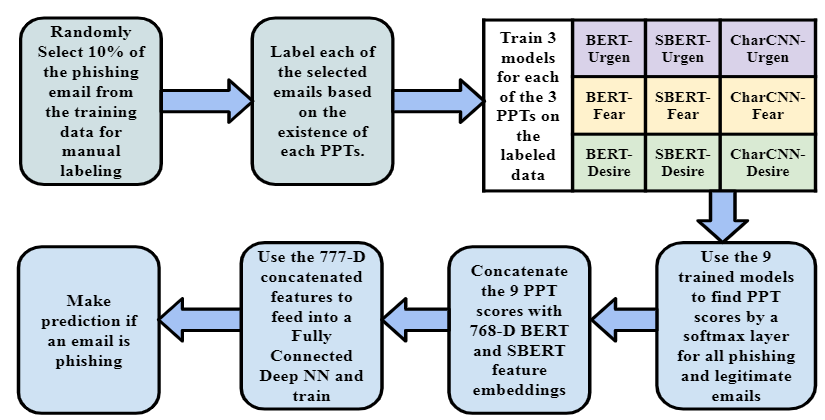– Identified and quantified three dominant psychological traits in phishing emails (PPT): A Sense of Urgency, Inducing Fear by Threatening, and Enticement with Desire, using BERT, Sentence-BERT, Character-level-CNN. Also employed GPT-2 for balanced training.