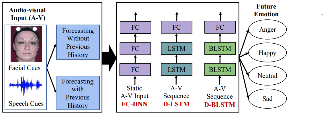 – Explored two distinct forecasting windows: utterance forecasting and time forecasting. Assessed the impact of incorporating both past and current audiovisual cues in the emotion forecasting process. Compared three deep networks: FCDNN, D-BLSTM, D-LSTM.